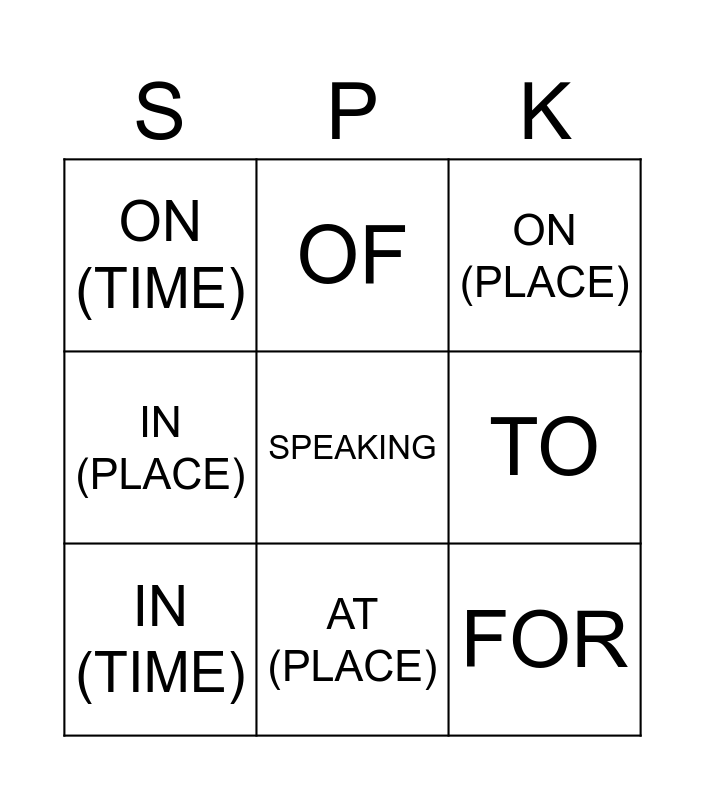 This bingo card has a free space and 11 words: ABOUT, AT (PLACE), FOR, IN (TIME), OF, ON (PLACE), TO, WITH, IN (PLACE), ON (TIME) and AT (TIME).