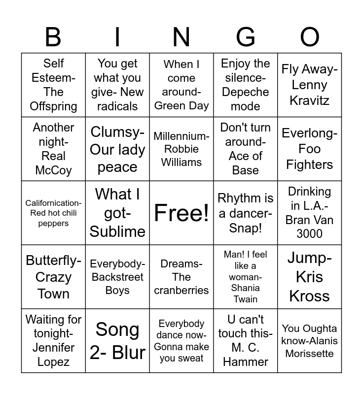 This bingo card has a free space and 63 words: Sandstorm- Darude, Party up- DMX, Close to you- Fun Factory, Jump- Kris Kross, Macarena- Los Del Rio, Black or white- Michael Jackson, You get what you give- New radicals, Losing my religion- R.E.M., Millennium- Robbie Williams, Black hole son-Soundgarden, Dreams- The cranberries, Better off alone- Alice Deejay, Drinking in L.A.- Bran Van 3000, Fly Away- Lenny Kravitz, Don't Speak-No Doubt, Another night- Real McCoy, What I got- Sublime, Self Esteem- The Offspring, I'm every woman- Whitney Houston, Don't turn around-Ace of Base, Everybody-Backstreet Boys, Butterfly-Crazy Town, Enjoy the silence-Depeche mode, Fly-Sugar Ray, What is love-Haddaway, I See- Letters to Cleo, Wonderwall-Oasis, Around the world- Red Hot chili peppers, Cherub Rock-Smaching Pumpkins, She's so high- Tal Bachman, Semi charmed life- Third eye blind, The sign- Ace of Bass, The bad touch- Bloodhound gang, Around the world- Daft Punk, policy of truth- Depeche mode, Everlong-Foo Fighters, Waiting for tonight-Jennifer Lopez, My own worst enemy- Lit, U can't touch this- M. C. Hammer, Step by Step- New kids on the block, Clumsy-Our lady peace, Californication-Red hot chili peppers, Rhythm is a dancer-Snap!, Let forever be- The chemical brothers, No Scrubs-TLC, You Oughta know-Alanis Morissette, Song 2- Blur, Du Hast-Rammstein, Man! I feel like a woman- Shania Twain, Come out and play- The offspring, Buddy Holly-Weezer, Barbie Girl-Aqua, Everybody dance now-Gonna make you sweat, Mr. Jones- Counting Crows, Groove is in the heart-Deee-lite, Take a picture- Filter, When I come around- Green Day, Brimful of Asha-Cornershop, The rhythm of the night-Corona, I'm afraid of Americans- David Bowie, Come undone- Duran Duran, I think I'm paranoid- Garbage, Steal my sunshine- Len and Smells like teen spirit- Nirvana.