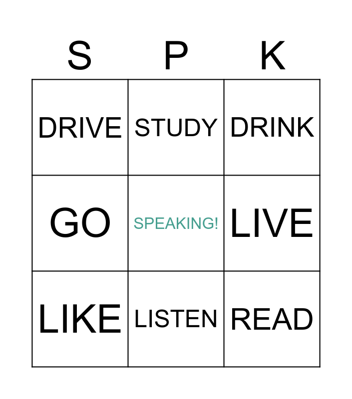 This bingo card has a free space and 17 words: COOK, DO, DRINK, DRIVE, EAT, GO, HAVE, LIKE, LISTEN, LIVE, NEED, PLAY, READ, STUDY, WANT, WATCH and WORK.