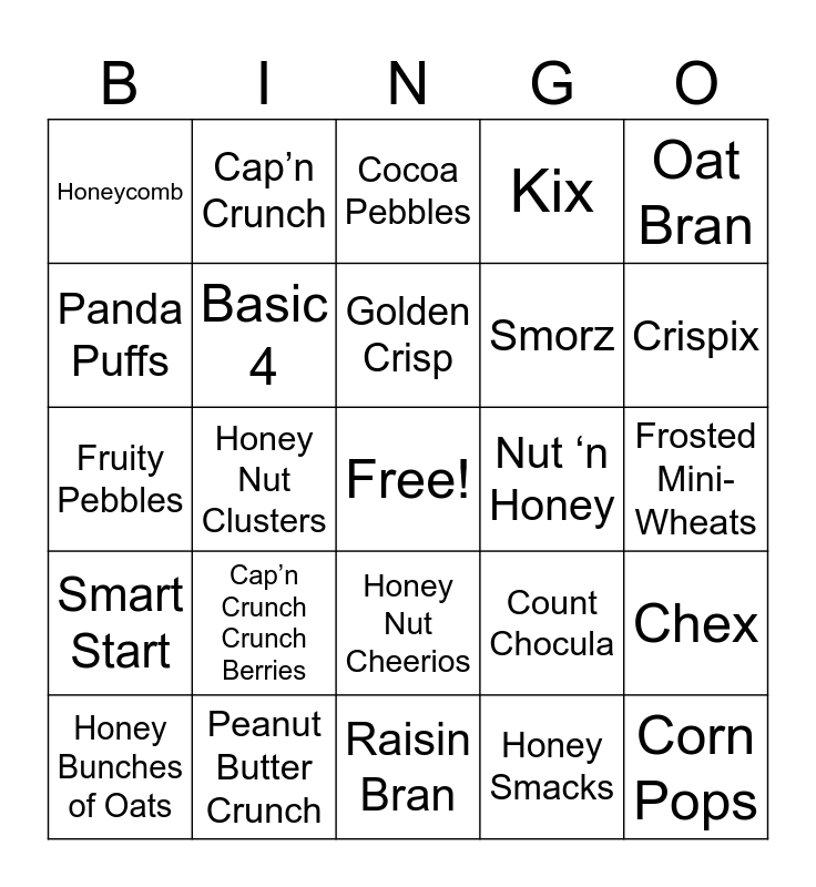 This bingo card has a free space and 48 words: Apple Jacks, Corn Pops, Life, Raisin Bran, Cap’n Crunch Crunch Berries, Franken Berry, Cap’n Crunch, Corn Flakes, Panda Puffs, Reese’s Puffs, Basic 4, Kix, Chex, Count Chocula, Lucky Charms, Rice Krispies, Golden Crisp, Nut ‘n Honey, Cheerios, Oat Bran, Honey Nut Clusters, Honey Smacks, Honeycomb, Smorz, Lucky Charms, Crispix, Honey Bunches of Oats, Special K, Honey Nut Cheerios, Smart Start, Cinnamon Toast Crunch, Frosted Flakes, Golden Grahams, Trix, Peanut Butter Crunch, Total, Cocoa Puffs, Frosted Mini-Wheats, Grape-Nuts, Wheaties, Raisin Nut Bran, Cinnamon Life, Cocoa Pebbles, Fruit Loops, Fruity Pebbles, Alpha Bites, Special K Vanilla &Almond and Boo Berry.