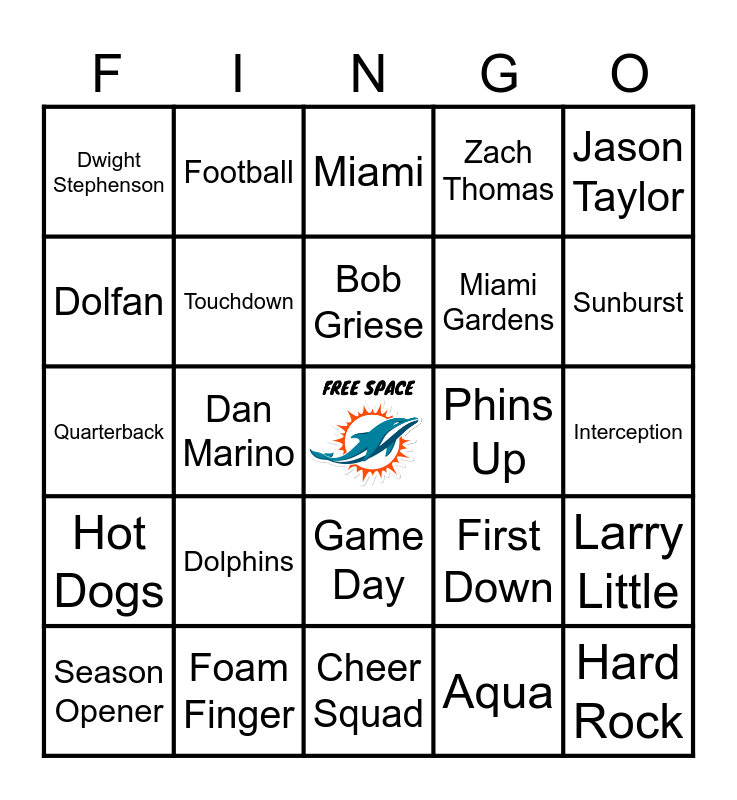 This bingo card has a free space and 51 words: 1972 Perfect Season, Dolphins, Orange, Aqua, Sunburst, Killer B’s, Football, NFL, Miami Gardens, Hard Rock, Quarterback, Touchdown, First Down, Interception, Field Goal, Mascot, Miami, Phins Up, The Fish, Dolfan, Dan Marino, Nat Moore, Zach Thomas, Jason Taylor, Don Shula, Larry Csonka, Bob Griese, Jimmy Johnson, Larry Little, Dwight Stephenson, Super Bowl, Draft Day, End Zone, Extra Point, Two Point, Wide Receiver, Running Back, Kickoff, Goal Line, Victory Dance, Foam Finger, Game Day, Jersey, Halftime Show, Season Opener, Super Fan, Cheer Squad, Fan Zone, Tailgate Party, Hot Dogs and Jason Jenkins.