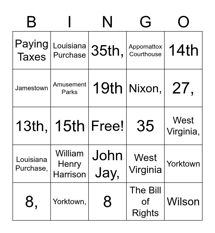 This bingo card has a free space and 46 words: Nixon, Wilson, 27, 8, William Henry Harrison, John Jay, Louisiana Purchase, 19th, Jamestown, Merrimack, Amusement Parks, Appomattox Courthouse, Yorktown, West Virginia, Virginia Declaration of Rights, Thomas Jefferson, 19th, 35, 13th, 14th, 15th, The Bill of Rights, Paying Taxes, Nixon,, Wilson,, 27,, 8,, William Henry Harrison,, John Jay,, Louisiana Purchase,, 19th,, Jamestown,, Merrimack,, Amusement Parks,, Appomattox Courthouse,, Yorktown,, West Virginia,, Virginia Declaration of Rights,, Thomas Jefferson,, 8th, 19th,, 35th,, 13th,, 14th,, 15th, and The Bill of Rights and Paying Taxes..