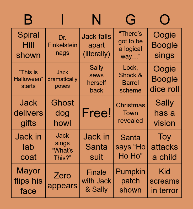 This bingo card has a free space and 24 words: Jack sings “What’s This?”, Zero appears, Sally sews herself back, Mayor flips his face, Oogie Boogie sings, Spiral Hill shown, “This is Halloween” starts, Dr. Finkelstein nags, Christmas Town revealed, Jack in Santa suit, Lock, Shock & Barrel scheme, Jack delivers gifts, Santa says “Ho Ho Ho”, Toy attacks a child, Jack dramatically poses, Pumpkin patch shown, Sally has a vision, Jack falls apart (literally), Oogie Boogie dice roll, Ghost dog howl, Kid screams in terror, Jack in lab coat, “There’s got to be a logical way…” and Finale with Jack & Sally.