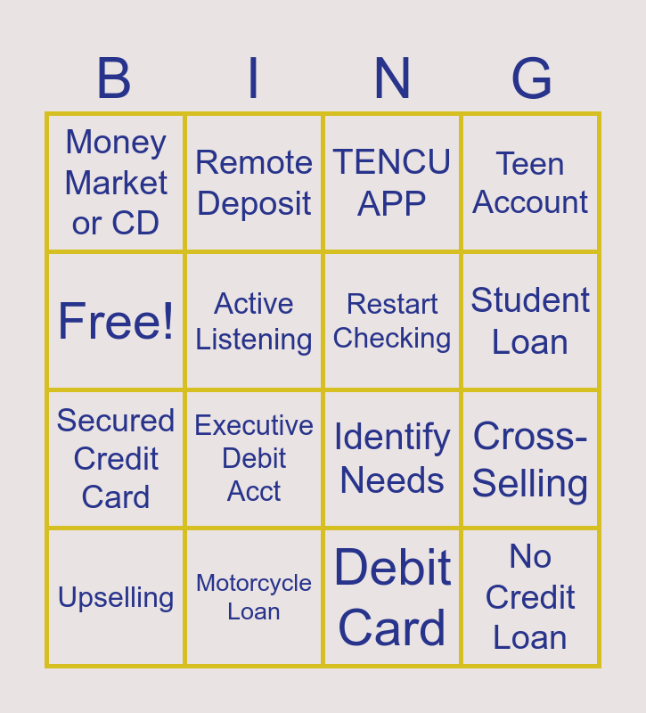 This bingo card has 16 words: Motorcycle Loan, Cross-Selling, TENCU APP, Money Market or CD, Secured Credit Card, Remote Deposit, Identify Needs, Debit Card, Free!, Active Listening, Upselling, Teen Account, Executive Debit Acct, Student Loan, Restart Checking and No Credit Loan.