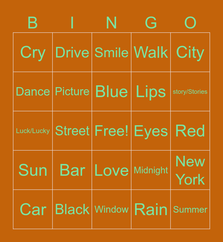 This bingo card has a free space and 24 words: Bar, Black, Blue, Car, City, Cry, Dance, Drive, Eyes, Love, Lips, Luck/Lucky, Midnight, New York, Picture, Rain, Red, Smile, story/Stories, Street, Summer, Sun, Walk and Window.