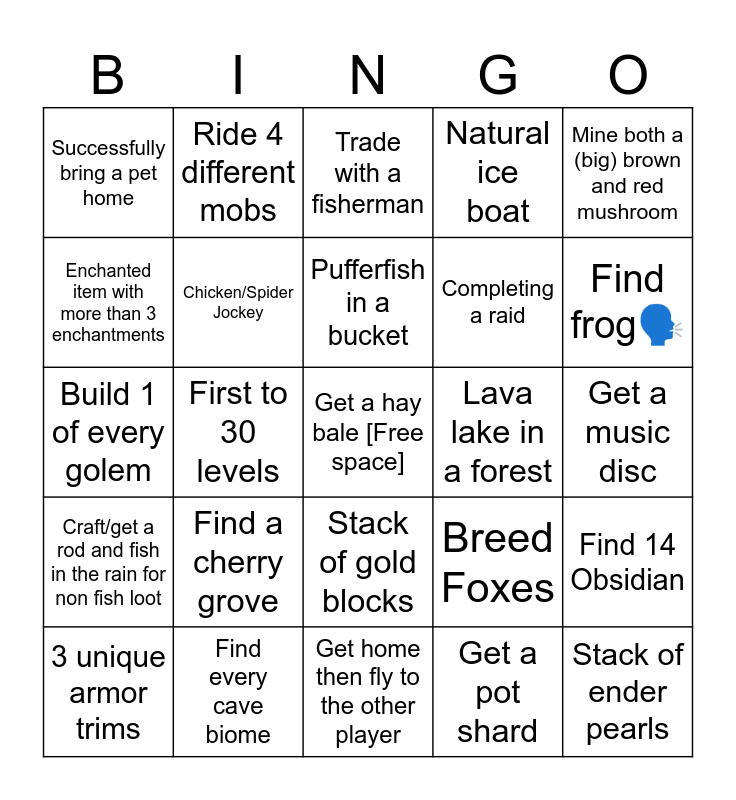 This bingo card has a free space and 24 words: Find a cherry grove, Find every cave biome, Pufferfish in a bucket, 3 unique armor trims, Mine both a (big) brown and red mushroom, Successfully bring a pet home, Enchanted item with more than 3 enchantments, Ride 4 different mobs, Lava lake in a forest, Stack of gold blocks, Completing a raid, Build 1 of every golem, Breed Foxes, Find 14 Obsidian, Chicken/Spider Jockey, Get a pot shard, Get a music disc, Trade with a fisherman, Find frog🗣️, First to 30 levels, Stack of ender pearls, Craft/get a rod and fish in the rain for non fish loot, Natural ice boat and Get home then fly to the other player.