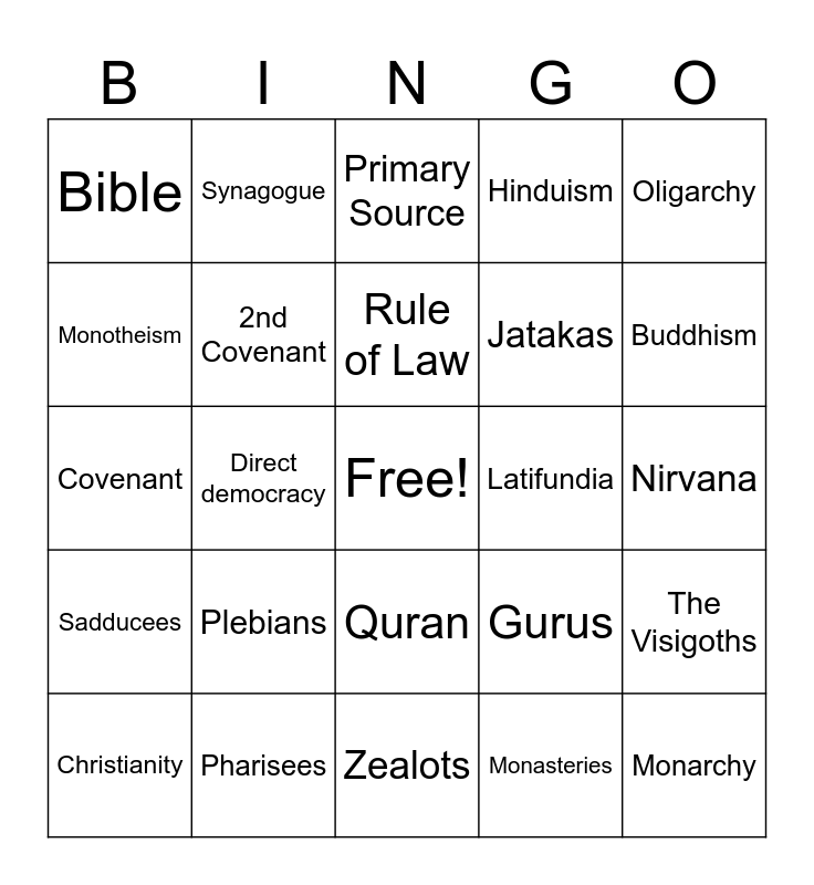 This bingo card has a free space and 76 words: Neolithic Revolution, Irrigation, Primary Source, Secondary Source, Tertiary Source, Fertile Crescent, Civilization, Institution, City-state, Dynasty, Empire, Hammurabi’s Code, Rule of Law, Monotheism, Polytheism, Direct democracy, Citizens, Monarchy, Theocracy, Oligarchy, Judaism, Covenant, 2nd Covenant, Synagogue, Hinduism, Vedas, Reincarnation, Karma, Dharma, Atman, Brahman, Caste System, Temple, Gurus, Buddhism, Jatakas, 4 noble truths, Eightfold Path, Nirvana, Monasteries, Confusianism, Analects, Filial Piety, Shinto, Worship of Kami, Shrine, Christianity, Bible, Apostles, Church, Islam, Quran, 5 Pillars, Ramadan, Mosque, Republic, Dictator, Consuls, 12 Tables, Tribunes, Plebians, Legion, 1st Punic War, 2nd Punic War, 3rd Punic War, Provinces, Latifundia, Mercenaiers, Edict of Milan, The Huns, The Visigoths, Sadducees, Pharisees, Essenes, Zealots and Edict of Thessalonica.
