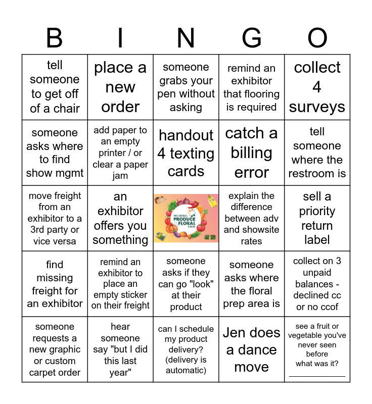 This bingo card has a free space and 24 words: remind an exhibitor to place an empty sticker on their freight, hear someone say "but I did this last year", handout 4 texting cards, someone requests a new graphic or custom carpet order, collect 4 surveys, tell someone to get off of a chair, someone asks where to find show mgmt, place a new order, explain the difference between adv and showsite rates, someone asks if they can go "look" at their product, catch a billing error, move freight from an exhibitor to a 3rd party or vice versa, someone asks where the floral prep area is, collect on 3 unpaid balances - declined cc or no ccof, add paper to an empty printer / or clear a paper jam, Jen does a dance move, sell a priority return label, someone grabs your pen without asking, tell someone where the restroom is, an exhibitor offers you something, see a fruit or vegetable you've never seen before what was it? _____________, find missing freight for an exhibitor, remind an exhibitor that flooring is required and can I schedule my product delivery? (delivery is automatic).