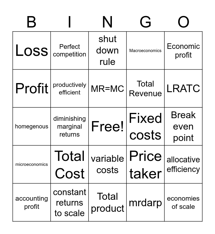 This bingo card has a free space and 25 words: Total Cost, Total product, MR=MC, accounting profit, Economic profit, Loss, Profit, Perfect competition, Fixed costs, variable costs, Total Revenue, homegenous, Price taker, allocative efficiency, productively efficient, Long run equilbrium, Break even point, shut down rule, LRATC, diminishing marginal returns, economies of scale, constant returns to scale, microeconomics, Macroeconomics and mrdarp.