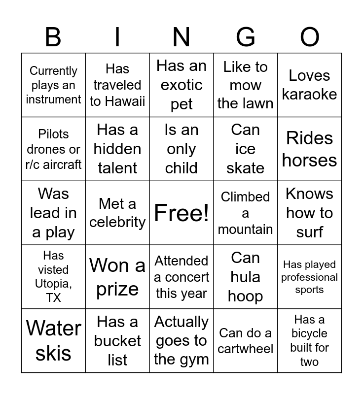 This bingo card has a free space and 29 words: Water skis, Appeared in a film or in TV, Met a celebrity, Twin or triplet, Currently plays an instrument, Has an exotic pet, Has a hidden talent, Won a prize, Climbed a mountain, Has a bucket list, Knows how to surf, Has a bicycle built for two, Actually goes to the gym, Can do a cartwheel, Rides horses, Knows martial arts, Attended a concert this year, Has visted Utopia, TX, Loves karaoke, Was lead in a play, Can hula hoop, Has been skydiving, Can ice skate, Pilots drones or r/c aircraft, Like to mow the lawn, Has traveled to Hawaii, Has played professional sports, Is an only child and Likes bats.