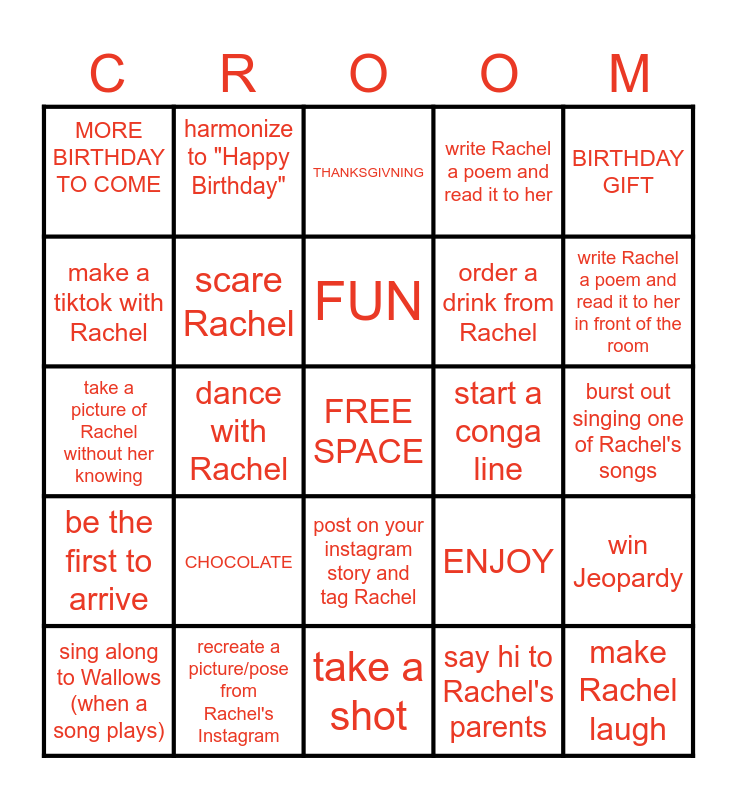This bingo card has a free space and 34 words: get Rachel to take a shot (MAX 2), take a picture, make a random, awkward toast, burst out singing a song from a musical, burst out singing one of Rachel's songs, make a tiktok with Rachel, scare Rachel, take a shot, order a drink from Rachel, make Rachel laugh, take a picture of Rachel without her knowing, harmonize to "Happy Birthday", say hi to Rachel's parents, write a Guest Check note, be the first to arrive, dance with Rachel, post on your instagram story and tag Rachel, start a conga line, win Jeopardy, sing along to Wallows (when a song plays), recreate a picture/pose from Rachel's Instagram, prank Rachel, write Rachel a poem and read it to her, write Rachel a poem and read it to her in front of the room, JELLY, CHOCOLATE, THANKSGIVNING, DANCING PARTY, BIRTHDAY GIFT, MORE BIRTHDAY TO COME, PINATA, FUN, ENJOY and FOOD.