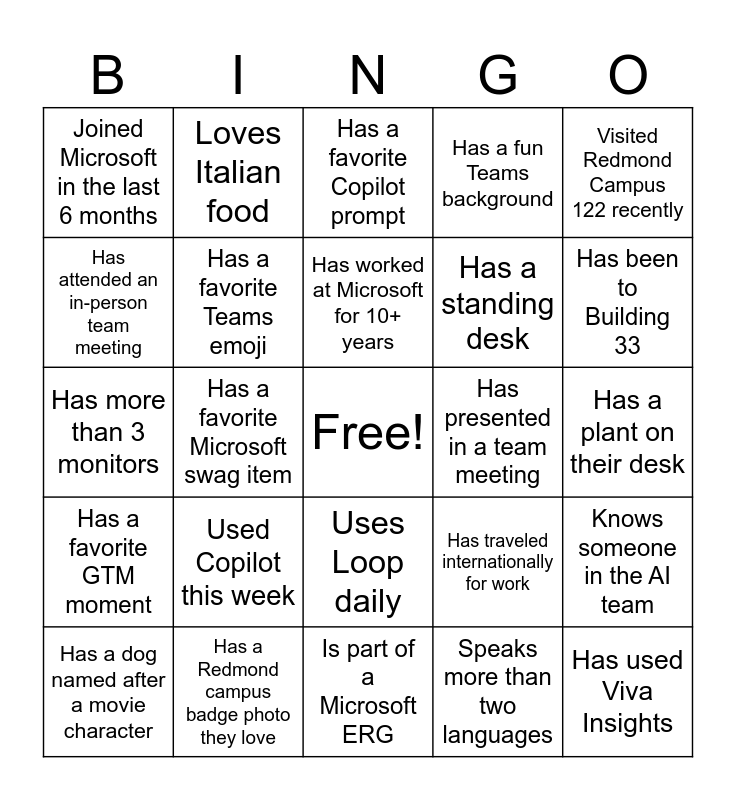 This bingo card has a free space and 25 words: Used Copilot this week, Is part of a Microsoft ERG, Has worked at Microsoft for 10+ years, Has a dog named after a movie character, Visited Redmond Campus 122 recently, Joined Microsoft in the last 6 months, Has attended an in-person team meeting, Loves Italian food, Has presented in a team meeting, Uses Loop daily, Has a standing desk, Has more than 3 monitors, Has traveled internationally for work, Knows someone in the AI team, Has a favorite Teams emoji, Has worked in more than one Microsoft org, Has a plant on their desk, Has a favorite Copilot prompt, Has been to Building 33, Has a favorite Microsoft swag item, Has used Viva Insights, Has a Redmond campus badge photo they love, Has a favorite GTM moment, Has a fun Teams background and Speaks more than two languages.
