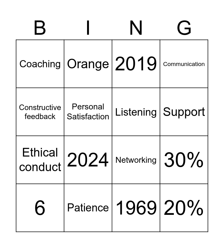 This bingo card has 35 words: Guidance and Growth, Trust, Setting Goals, Listening, Mentee teaches the mentor, Communication, Personal Satisfaction, Career development, Support, Commitment, Networking, Constructive feedback, Openness, Confidence, Coaching, Patience, Initiative, 30%, 20%, 6, All of the above, 9 months, Once a month, Set goals, 2019, 2024, Availability and Goals, Follow through on goals, Ethical conduct, 1969, 1986, Blue, Over 80, Orange and Downtown to Gresham.