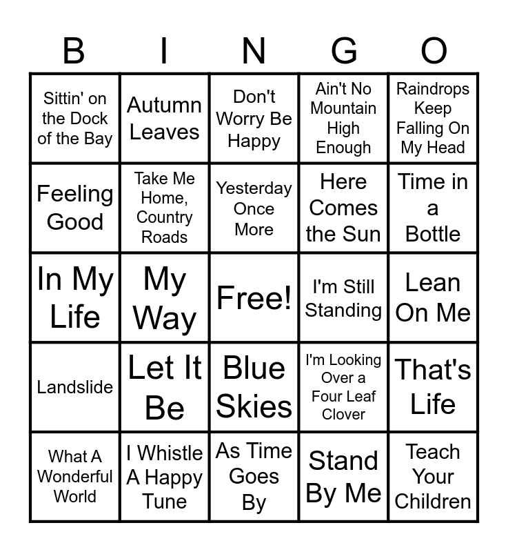 This bingo card has a free space and 24 words: Let It Be, I Whistle A Happy Tune, Yesterday Once More, What A Wonderful World, Raindrops Keep Falling On My Head, Sittin' on the Dock of the Bay, Feeling Good, Autumn Leaves, I'm Still Standing, Blue Skies, Here Comes the Sun, In My Life, I'm Looking Over a Four Leaf Clover, That's Life, Take Me Home, Country Roads, Stand By Me, Lean On Me, Don't Worry Be Happy, Time in a Bottle, My Way, Teach Your Children, Landslide, Ain't No Mountain High Enough and As Time Goes By.
