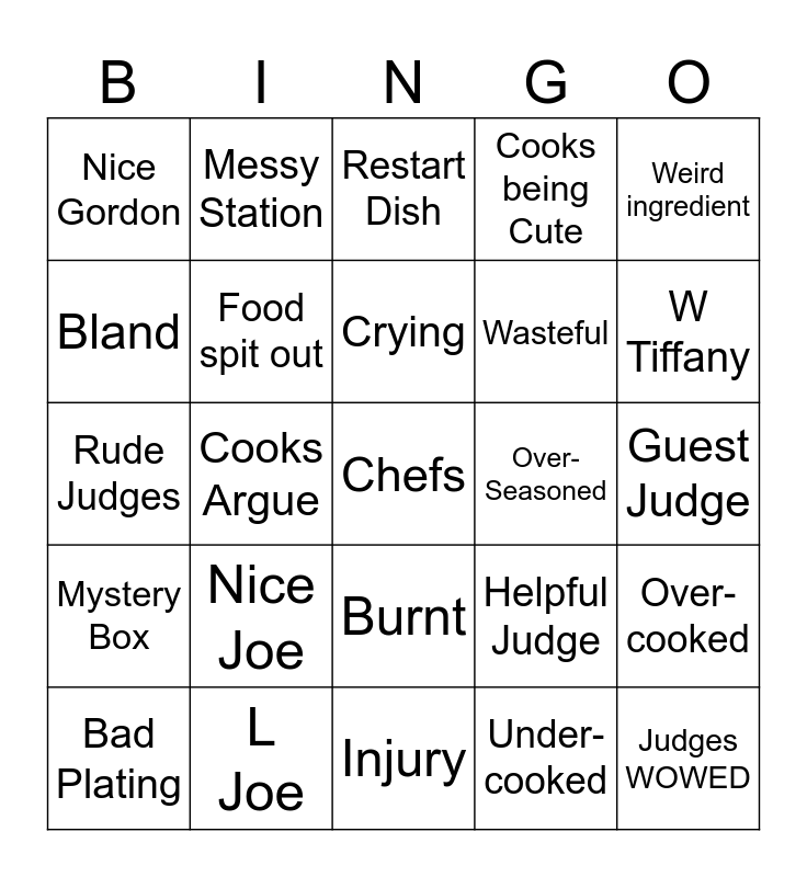 This bingo card has a free space and 24 words: Nice Joe, L Joe, Crying, Bad Plating, Weird ingredient, Nice Gordon, Bland, Messy Station, Over-Seasoned, Burnt, Wasteful, Rude Judges, Helpful Judge, Over-cooked, Food spit out, Under-cooked, Guest Judge, Restart Dish, W Tiffany, Cooks Argue, Judges WOWED, Mystery Box, Cooks being Cute and Injury.