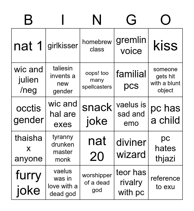 This bingo card has a free space and 24 words: tyranny drunken master monk, vaelus was in love with a dead god, oops! too many spellcasters, furry joke, kiss, nat 1, wic and julien /neg, girlkisser, vaelus is sad and emo, nat 20, familial pcs, occtis gender, diviner wizard, pc hates thjazi, taliesin invents a new gender, teor has rivalry with pc, pc has a child, homebrew class, someone gets hit with a blunt object, wic and hal are exes, reference to exu, thaisha x anyone, gremlin voice and worshipper of a dead god.