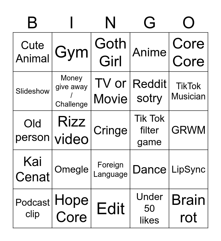 This bingo card has a free space and 24 words: Omegle, Hope Core, TV or Movie, Podcast clip, Core Core, Cute Animal, Slideshow, Gym, Tik Tok filter game, Foreign Language, Reddit sotry, Old person, Dance, LipSync, Money give away / Challenge, Under 50 likes, GRWM, Goth Girl, TikTok Musician, Rizz video, Brain rot, Kai Cenat, Anime and Edit.