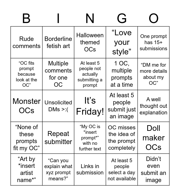 This bingo card has a free space and 24 words: Repeat submitter, “Can you explain what xyz prompt means?”, At least 5 people not actually submitting a prompt, “Art by *insert artist name*”, One prompt has 15+ submissions, Rude comments, “OC fits prompt because look at the OC”, Borderline fetish art, At least 5 people submit just an image, “My OC is *insert prompt*” with no further text, 1 OC, multiple prompts at a time, Monster OCs, OC misses the idea of the prompt completely, Doll maker OCs, Multiple comments for one OC, At least 5 people select a day not available, A well thought out explanation, Halloween themed OCs, “DM me for more details about my OC”, Unsolicited DMs >:(, Didn’t even submit an image, “None of these prompts fit my OC”, “Love your style” and Links in submission.
