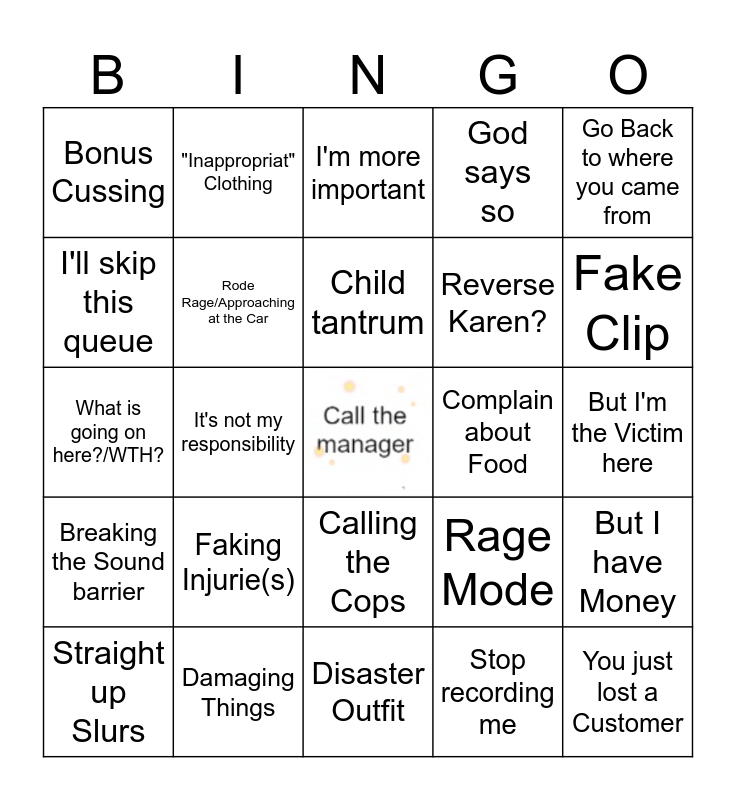 This bingo card has a free space and 65 words: Free Space: Call the Manager, I have RIGHTS, Airport/Airplain BS, But I have Money, Gimme a Refund, Alcohol 100, "Inappropriat" Clothing, Throwing Stuff, Child tantrum, Mah propertieh, Calling the Cops, Speak English!, But I'm the Victim here, Go Back to where you came from, Holding up a queue, I'll skip this queue, It's not my responsibility, Bonus Cussing, My Child is more important, Reverse Karen?, Faking Injurie(s), Breaking the Sound barrier, God says so, This is TOTALLY YOUR FAULT, Literal Assault, Horror Monster Karen, Transphobia/Homophobia, Stalker Karen/Peep, You just lost a Customer, Karen Jumpscare, Straight up Slurs, Turning Red from Rage, Fake Crying/Crying, Screw u in Particular, Rage Mode, Damaging Things, Okay Grandma, back to Bed, What is going on here?/WTH?, Stop recording me, Parking/Shopping, Rode Rage/Approaching at the Car, Impossible Demand, Complain about Food, Customer Support, Stealing Stuff, Stacy (Teenage Karen), Fake Clip, Arguing with Cops, Both/All are Karens, Smack out of Hand, Very Funny, Reception Karen, Nightmare Neighbors, Disaster Outfit, Mask/Antivax Karen, Don't you know who i am, Multiple Karens, I'm more important, Made me Cringe, Verbally Assault Service Workers, I'm gonna Sue you, DONT TOUCH ME, You're Hurting Me, Baseless Accusation and Owning a Karen Epically.