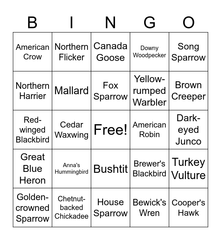 This bingo card has a free space and 24 words: Anna's Hummingbird, Chetnut-backed Chickadee, Fox Sparrow, Golden-crowned Sparrow, Song Sparrow, American Crow, Northern Harrier, Northern Flicker, American Robin, Bushtit, Yellow-rumped Warbler, Red-winged Blackbird, Brewer's Blackbird, Turkey Vulture, Mallard, Bewick's Wren, Dark-eyed Junco, Canada Goose, Brown Creeper, Cedar Waxwing, Cooper's Hawk, Great Blue Heron, Downy Woodpecker and House Sparrow.