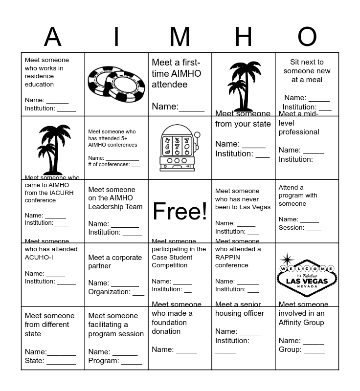 This bingo card has 6 images, a free space and 23 words: Meet someone from different state Name:_______ State: _______, Meet someone on the AIMHO Executive Board Name: ______ Institutions:_____, Meet someone on the AIMHO Leadership Team Name: _______ Institution: _____, Meet someone who works in housing operations Name: ______ Institution: _____, Meet someone who works in residence education Name: ______ Institution: _____, Meet a first-time AIMHO attendee Name:_____, Meet someone who has attended 5+ AIMHO conferences Name: ___________ # of conferences: ___, Meet a corporate partner Name: _______ Organization: ___, Meet someone who has never been to Las Vegas Name: _____ Institution: ___, Meet someone facilitating a program session Name: ______ Program: _____, Attend a program with someone Name: _____ Session: ____, Meet someone involved in an Affinity Group Name: _____ Group: _____, Meet someone who made a foundation donation Name: _____, Meet a senior housing officer Name: _____ Institution: _____, Meet a mid-level professional Name: _____ Institution: ___, Meet an entry-level professional Name: _______ Institution: ____, Meet someone participating in the Case Student Competition Name: _____ Institution: __, Meet someone who has attended ACUHO-I Name: _____ Institution: _____, Sit next to someone new at a meal Name: _____ Institution: ___, Meet someone who came to AIMHO from the IACURH conference Name: ______ Institution: ____, Meet someone who attended a RAPPIN conference Name: ______ Institution: ___, Meet someone who has worked at more than one AIMHO institution Name: _____ Institution: ___ and Meet someone from your state Name: _____ Institution: ___.