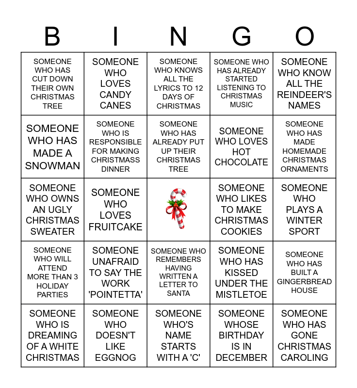 This bingo card has a free space and 44 words: SOMEONE WEARING RED, SOMEONE UNAFRAID TO SAY THE WORK 'POINTETTA', SOMEONE WHO DOES NOT GIVE PRESENTS FOR CHRISTMAS, SOMEONE WHOSE BIRTHDAY IS IN DECEMBER, SOMEONE WHO HAS SEEN A LIVE REINDEER IN PERSON, SOMEONE WHO HAS PARTAKEN IN ELF ON THE SHELF, SOMEONE WHO IS RESPONSIBLE FOR MAKING CHRISTMASS DINNER, SOMEONE WHO HAS NEVER SEEN SNOW IN PERSON, SOMEONE WHO HAS ALREADY STARTED LISTENING TO CHRISTMAS MUSIC, SOMEONE WHO HAS GONE CHRISTMAS CAROLING, SOMEONE WHO HAS CUT DOWN THEIR OWN CHRISTMAS TREE, SOMEONE WHO DOESN'T LIKE EGGNOG, SOMEONE WHO HAS KISSED UNDER THE MISTLETOE, SOMEONE WHO PLAYS A WINTER SPORT, SOMEONE WHO HAS A STOCKING FOR THEIR PET, SOMEONE WHO PUT UP MORE THAN ONE CHRISTMAS TREE, SOMEONE WHO'S NAME STARTS WITH A 'C', SOMEONE WHO LIKES TO MAKE CHRISTMAS COOKIES, SOMEONE WHO CAN PLAY CHRISTMAS SONGS ON AN INSTRUMENT, SOMEONE WHO OWNS AN UGLY CHRISTMAS SWEATER, SOMEONE WHO LOVES CANDY CANES, SOMEONE WHO REMEMBERS HAVING WRITTEN A LETTER TO SANTA, SOMEONE WHO OPENS PRESENTS ON CHRISTMAS EVE, SOMEONE WHO KNOW ALL THE REINDEER'S NAMES, SOMEONE WHO CAN NAME 5 CHRISTMAS SONGS, SOMEONE WHO CAN SING THE FIRST LINE OF A CHRISTMAS SONG, SOMEONE WHO HAS ALREADY PUT UP THEIR CHRISTMAS TREE, SOMEONE WHO HAS TAKEN A SLEIGH RIDE, SOMEONE WHO HAS BUILT A GINGERBREAD HOUSE, SOMEONE WHO IS DREAMING OF A WHITE CHRISTMAS, SOMEONE WHO IS WEARING CHRISTMAS SOCKS, SOMEONE WHO KNOWS ALL THE LYRICS TO 12 DAYS OF CHRISTMAS, SOMEONE WHO HAS EVER BEEN IN A CHRISTMAS PLAY, SOMEONE WHO HAS SEEN "IT'S A WONDERFUL LIFE", SOMEONE WHO WILL ATTEND MORE THAN 3 HOLIDAY PARTIES, SOMEONE WHO SHOPPED ON BLACK FRIDAY THIS YEAR, SOMEONE WHO HAS A NATIVITY ON DISPLAY, SOMEONE WHO HAS GONE CHRISTMAS CAROLING, SOMEONE WHO HAS MADE HOMEMADE CHRISTMAS ORNAMENTS, SOMEONE WHO HAS MADE A SNOWMAN, SOMEONE WHO LOVES FRUITCAKE, SOMEONE WHO HAS AN ADVENT CALENDAR, SOMEONE WHO LOVES HOT CHOCOLATE and SOMEONE WHO MAKES TAMALES FOR CHRISTMAS.