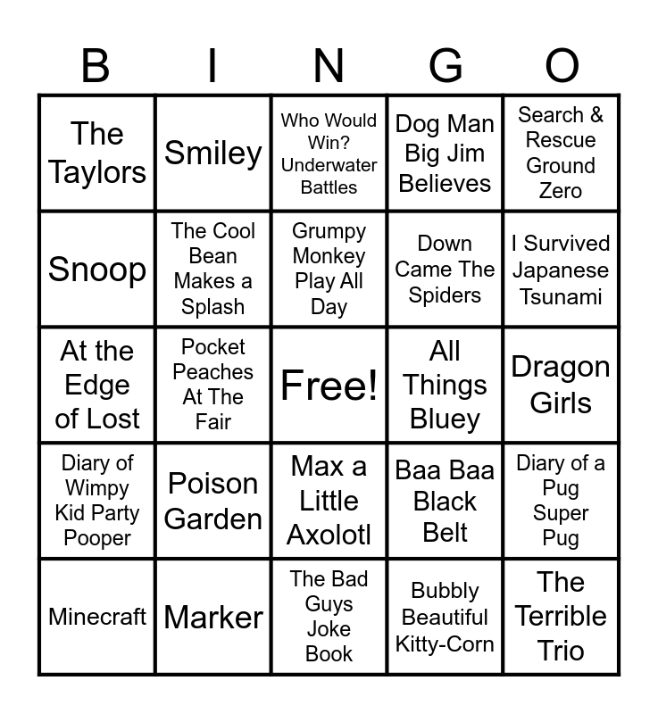 This bingo card has a free space and 24 words: Poison Garden, Marker, Grumpy Monkey Play All Day, Minecraft, Search & Rescue Ground Zero, The Taylors, Snoop, Smiley, All Things Bluey, Max a Little Axolotl, Down Came The Spiders, At the Edge of Lost, Baa Baa Black Belt, Diary of a Pug Super Pug, The Cool Bean Makes a Splash, Bubbly Beautiful Kitty-Corn, Dragon Girls, Who Would Win? Underwater Battles, I Survived Japanese Tsunami, Pocket Peaches At The Fair, The Terrible Trio, Diary of Wimpy Kid Party Pooper, Dog Man Big Jim Believes and The Bad Guys Joke Book.