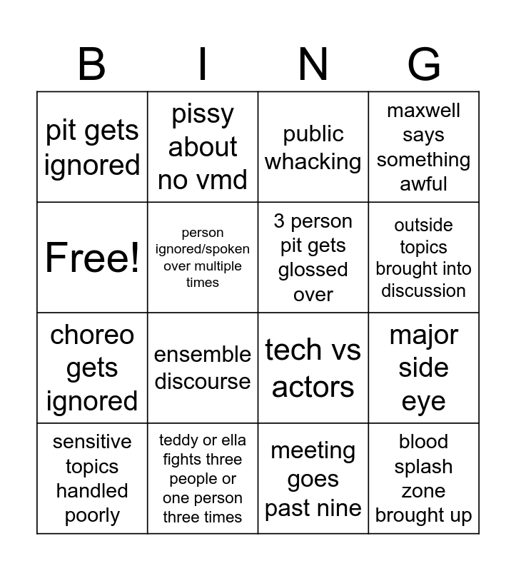This bingo card has 16 words: teddy or ella fights three people or one person three times, major side eye, public whacking, pit gets ignored, choreo gets ignored, pissy about no vmd, tech vs actors, meeting goes past nine, Free!, person ignored/spoken over multiple times, sensitive topics handled poorly, maxwell says something awful, ensemble discourse, outside topics brought into discussion, 3 person pit gets glossed over and blood splash zone brought up.