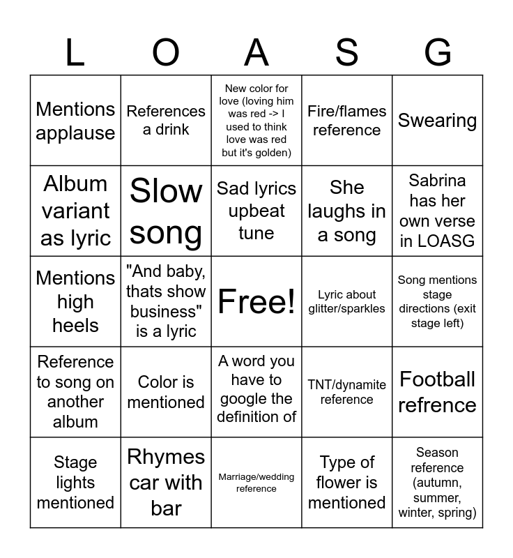 This bingo card has a free space and 24 words: Color is mentioned, Rhymes car with bar, Sad lyrics upbeat tune, Stage lights mentioned, Swearing, Mentions applause, Album variant as lyric, References a drink, Lyric about glitter/sparkles, A word you have to google the definition of, She laughs in a song, Mentions high heels, TNT/dynamite reference, Football refrence, Slow song, Type of flower is mentioned, Song mentions stage directions (exit stage left), New color for love (loving him was red -> I used to think love was red but it's golden), Sabrina has her own verse in LOASG, "And baby, thats show business" is a lyric, Season reference (autumn, summer, winter, spring), Reference to song on another album, Fire/flames reference and Marriage/wedding reference.