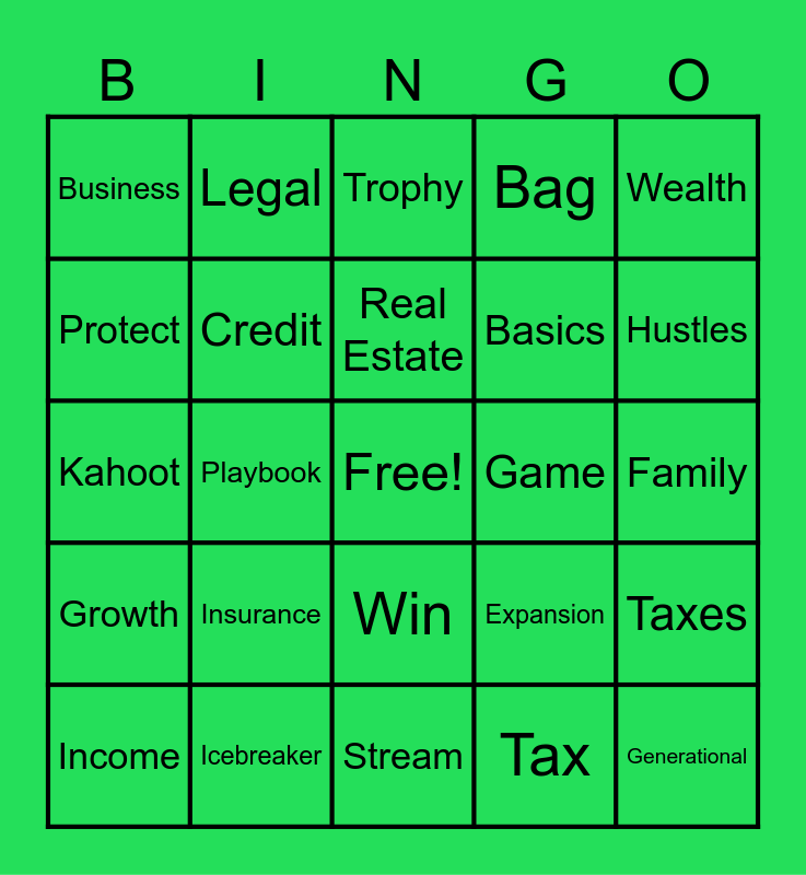 This bingo card has a free space and 37 words: Legacy, Touchdown, Hustle, Credit, Taxes, Insurance, Real Estate, Estate Planning, Wealth, Money, Playbook, Bag, Generational, Family, Protect, Growth, Assets, Trophy, Win, Game, Business, Hustles, Income, Stream, Tips, Tax, Legal, Planning, Jersey, Prize, Chat, Icebreaker, Kahoot, Ownership, Expansion, Basics and Strategies.
