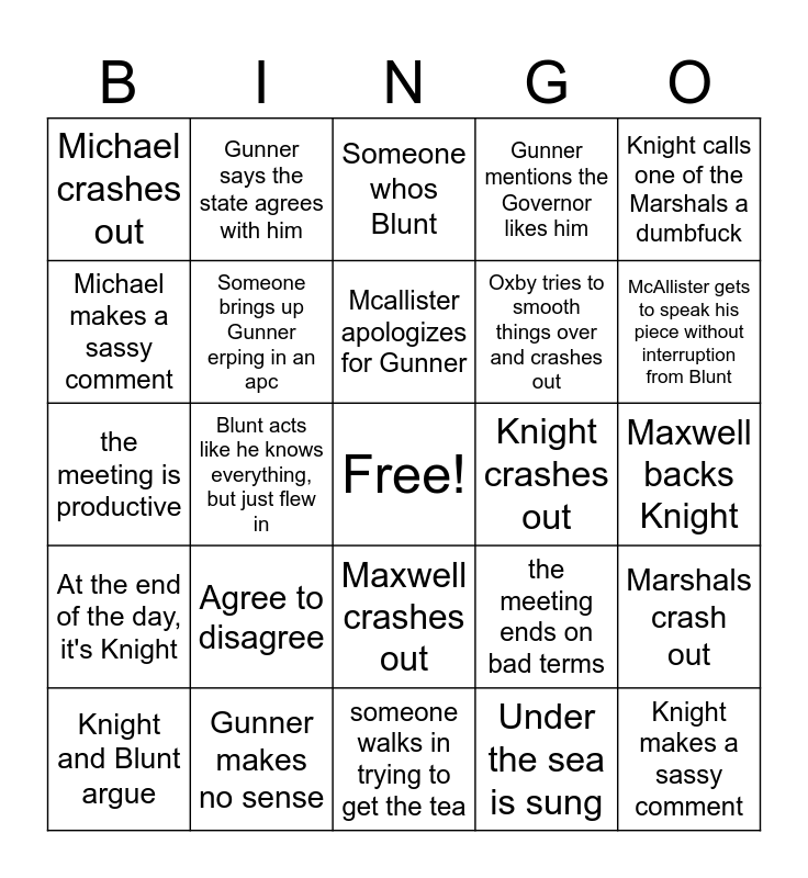 This bingo card has a free space and 24 words: Agree to disagree, Gunner makes no sense, Mcallister apologizes for Gunner, Knight and Blunt argue, Knight calls one of the Marshals a dumbfuck, Michael crashes out, Michael makes a sassy comment, Gunner says the state agrees with him, Knight crashes out, Maxwell crashes out, Oxby tries to smooth things over and crashes out, the meeting is productive, the meeting ends on bad terms, Marshals crash out, Someone brings up Gunner erping in an apc, Under the sea is sung, Maxwell backs Knight, Someone whos Blunt, McAllister gets to speak his piece without interruption from Blunt, Blunt acts like he knows everything, but just flew in, Knight makes a sassy comment, At the end of the day, it's Knight, Gunner mentions the Governor likes him and someone walks in trying to get the tea.