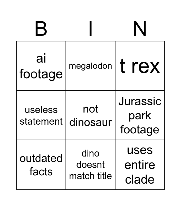 This bingo card has a free space and 8 words: Jurassic park footage, t rex, megalodon, outdated facts, ai footage, uses entire clade, useless statement and dino doesnt match title.
