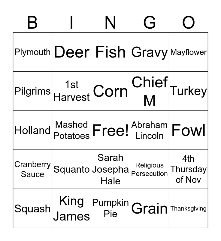 This bingo card has a free space and 24 words: Squanto, King James, Corn, Squash, Mayflower, Plymouth, Pilgrims, Deer, Abraham Lincoln, Sarah Josepha Hale, Chief M, Holland, Religious Persecution, 4th Thursday of Nov, 1st Harvest, Grain, Fowl, Fish, Turkey, Mashed Potatoes, Thanksgiving, Cranberry Sauce, Gravy and Pumpkin Pie.