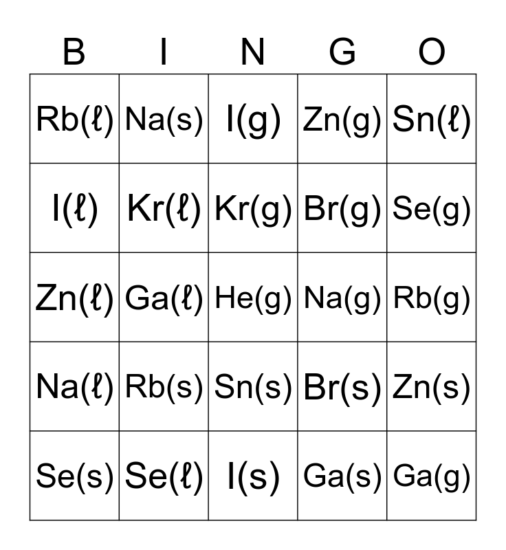 This bingo card has a free space and 27 words: Br(s), Br(ℓ), Br(g), I(s), I(ℓ), I(g), Na(s), Na(ℓ), Na(g), Zn(s), Zn(ℓ), Zn(g), Se(s), Se(ℓ), Se(g), Kr(s), Kr(ℓ), Kr(g), Rb(s), Rb(ℓ), Rb(g), Ga(s), Ga(ℓ), Ga(g), Sn(s), Sn(ℓ) and Sn(g)..