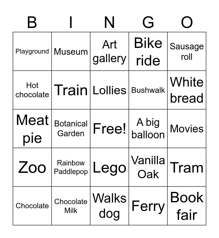 This bingo card has a free space and 24 words: Rainbow Paddlepop, Chocolate Milk, Lollies, Chocolate, Sausage roll, Playground, Hot chocolate, Museum, A big balloon, Lego, Bushwalk, Meat pie, Vanilla Oak, Tram, Train, Ferry, Movies, Art gallery, White bread, Botanical Garden, Book fair, Zoo, Bike ride and Walks dog.