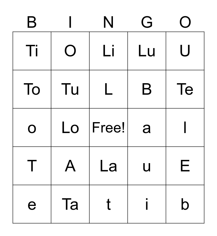 This bingo card has a free space and 24 words: A, Ta, L, e, U, Ti, To, O, a, La, B, o, u, E, Tu, i, l, Li, Te, Lo, b, T, Lu and t.