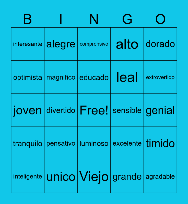 This bingo card has a free space and 77 words: Abierto, bien educado, comprensivo, decidido, emocionado, bajo, Afortunado, confundido, feliz, natural, calmado, cariñoso, educado, optimista, generoso, divertido, ligero, agradable, deportista, dorado, imaginativo, joven, magnifico, alegre, alto, amable, ambicioso, amigable, bonito, bueno, paciente, dulce, loco, excelente, extrovertido, leal, excepcional, fuerte, genial, grande, guapo, gracioso, hermoso, honesto, humilde, importante, inteligente, interesante, listo, justo, limpio, luminoso, moreno, maravilloso, nervioso, nuevo, organizado, ordenado, orgulloso, pelirojo, pensativo, pequeño, querido, responsable, relajado, rubio, serio, sensible, sincero, sociable, travieso, timido, tranquilo, unico, valiente, Viejo and viajero.