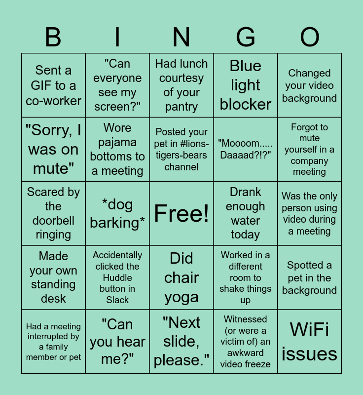 This bingo card has a free space and 24 words: Accidentally clicked the Huddle button in Slack, "Can you hear me?", Posted your pet in #lions-tigers-bears channel, Had a meeting interrupted by a family member or pet, Changed your video background, Sent a GIF to a co-worker, "Sorry, I was on mute", "Can everyone see my screen?", Drank enough water today, Did chair yoga, "Moooom..... Daaaad?!?", Scared by the doorbell ringing, Worked in a different room to shake things up, Spotted a pet in the background, Wore pajama bottoms to a meeting, Witnessed (or were a victim of) an awkward video freeze, Was the only person using video during a meeting, Had lunch courtesy of your pantry, Forgot to mute yourself in a company meeting, *dog barking*, WiFi issues, Made your own standing desk, Blue light blocker and "Next slide, please.".