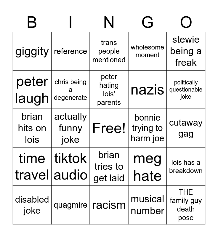 This bingo card has a free space and 24 words: tiktok audio, quagmire, peter hating lois' parents, disabled joke, stewie being a freak, giggity, peter laugh, reference, bonnie trying to harm joe, brian tries to get laid, nazis, brian hits on lois, meg hate, lois has a breakdown, chris being a degenerate, musical number, cutaway gag, trans people mentioned, politically questionable joke, actually funny joke, THE family guy death pose, time travel, wholesome moment and racism.