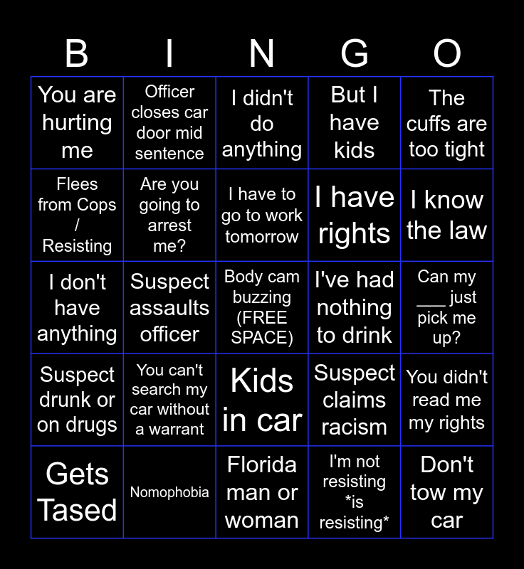 This bingo card has a free space and 39 words: Call my.., Don't have my ID, Car Crash, Are you going to arrest me?, Gets Tased, Kids in car, I have to go to work tomorrow, Begging no Jail, The cuffs are too tight, Suspect drunk or on drugs, Suspect assaults officer, But I have kids, Don't tow my car, Can my ___ just pick me up?, I've had nothing to drink, You can't search my car without a warrant, Not my drugs, You are hurting me, This is illegal, Suspect claims racism, Flees from Cops / Resisting, Florida man or woman, I have rights, I know the law, You're not allowed to touch me, I can't breathe, I'll sue you, What's the charge?, Call your supervisor, Officer closes car door mid sentence, Pregnant / illness, Incarceritis, I didn't do anything, Nomophobia, I'm not resisting *is resisting*, I plead the 5th, You didn't read me my rights, I don't have anything and My family member is a lawyer/cop.