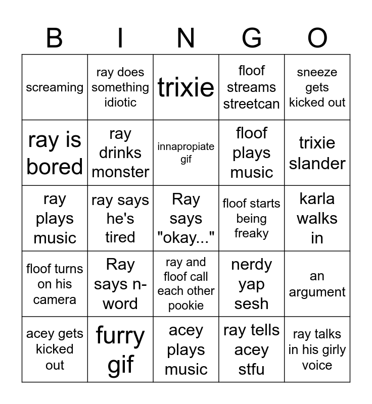 This bingo card has a free space and 24 words: Ray says n-word, furry gif, innapropiate gif, acey gets kicked out, sneeze gets kicked out, screaming, ray is bored, ray does something idiotic, floof starts being freaky, ray and floof call each other pookie, floof plays music, ray plays music, nerdy yap sesh, an argument, ray drinks monster, ray tells acey stfu, karla walks in, trixie, trixie slander, ray says he's tired, ray talks in his girly voice, floof turns on his camera, floof streams streetcan and acey plays music.