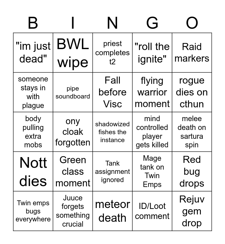 This bingo card has a free space and 24 words: Green class moment, Juuce forgets something crucial, Fall before Visc, Twin emps bugs everywhere, Raid markers, "im just dead", someone stays in with plague, BWL wipe, mind controlled player gets killed, Tank assignment ignored, flying warrior moment, body pulling extra mobs, Mage tank on Twin Emps, Red bug drops, pipe soundboard, ID/Loot comment, melee death on sartura spin, priest completes t2, rogue dies on cthun, ony cloak forgotten, Rejuv gem drop, Nott dies, "roll the ignite" and meteor death.