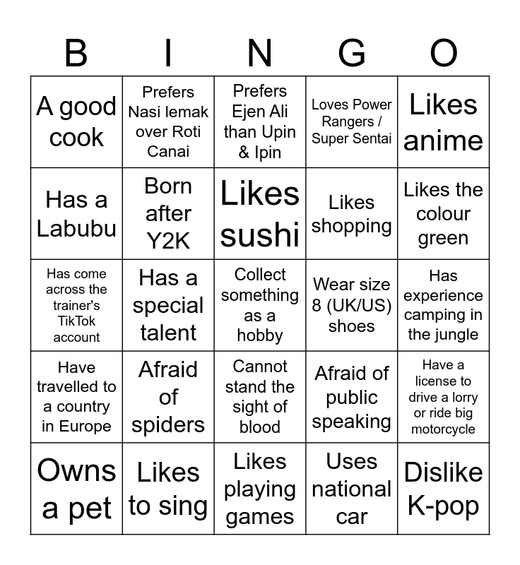 This bingo card has a free space and 29 words: Owns a pet, Dislike spicy food, Has a special talent, Entered a national-level competition, A good cook, Prefers Ejen Ali than Upin & Ipin, Born after Y2K, Afraid of spiders, Wear size 8 (UK/US) shoes, Likes to sing, Has experience camping in the jungle, Dislike K-pop, Likes playing games, Uses national car, Likes the colour green, Was not born in Selangor, Cannot stand the sight of blood, Have travelled to a country in Europe, Likes anime, Has come across the trainer's TikTok account, Afraid of public speaking, Can sleep anywhere, Likes shopping, Has a Labubu, Loves Power Rangers / Super Sentai, Prefers Nasi lemak over Roti Canai, Have a license to drive a lorry or ride big motorcycle, Likes sushi and Has Lego.