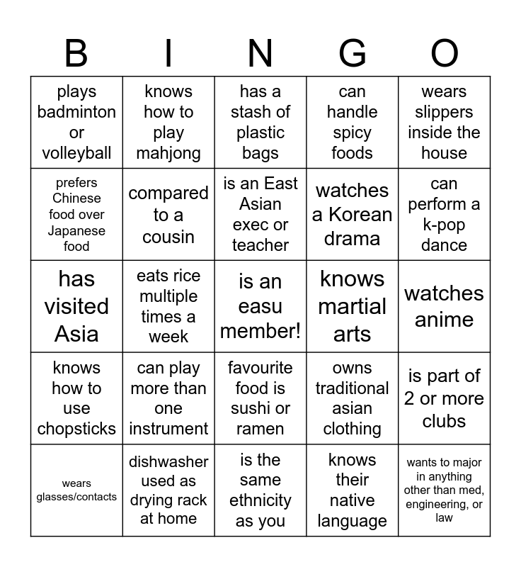This bingo card has a free space and 24 words: can play more than one instrument, dishwasher used as drying rack at home, is an East Asian exec or teacher, wears glasses/contacts, wears slippers inside the house, plays badminton or volleyball, prefers Chinese food over Japanese food, knows how to play mahjong, knows martial arts, favourite food is sushi or ramen, watches a Korean drama, has visited Asia, owns traditional asian clothing, is part of 2 or more clubs, compared to a cousin, knows their native language, watches anime, has a stash of plastic bags, can perform a k-pop dance, eats rice multiple times a week, wants to major in anything other than med, engineering, or law, knows how to use chopsticks, can handle spicy foods and is the same ethnicity as you.