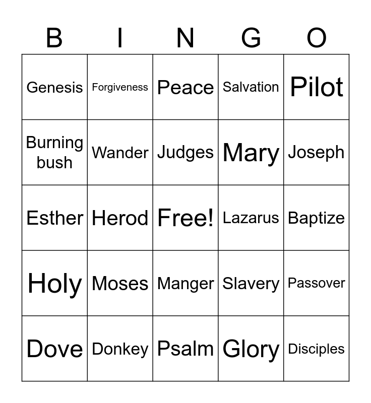 This bingo card has a free space and 89 words: Genesis, Adam, Genesis, Adam, We've, Flood, Rainbow, Dove, Ark, Abraham, Birthright, Eden, Burning bush, Moses, Egyptians, Slavery, Passover, Pharoah, Commandments, God, Jesus, Ruth, Esther, Lions Den, Psalm, David, Goliath, Shepherd, Anoint, Hebrews, Mary, Joseph, Temple, Forgiveness, Cross, Salvation, Pilot, Wisemen, Herod, Cesar, Angels, Disciples, Garden, Cross, Revelation, Gospel, Bible, Love, Joy, Peace, Patience, Kindness, Goodness, Faithfulness, Gentleness, Self control, Spirit, Holy, Olive branch, Parable, 5000, Samuel, Desert, Wilderness, Isaiah, Crucified, Grave, Risen, Donkey, Manger, Glory, Baptize, Fire, Wander, Judges, Repent, Redeemer, Lord, Prayer, Hallelujah, Lazarus, Plagues, Sermon, Followers, Christian, Kneel, Idols, Peter and Fishermen.