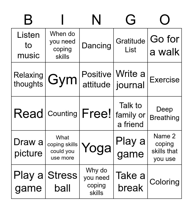 This bingo card has a free space and 24 words: What coping skills could you use more, Stress ball, Positive attitude, Play a game, Go for a walk, Listen to music, Relaxing thoughts, When do you need coping skills, Talk to family or a friend, Yoga, Write a journal, Read, Play a game, Name 2 coping skills that you use, Gym, Take a break, Deep Breathing, Dancing, Exercise, Counting, Coloring, Draw a picture, Gratitude List and Why do you need coping skills.