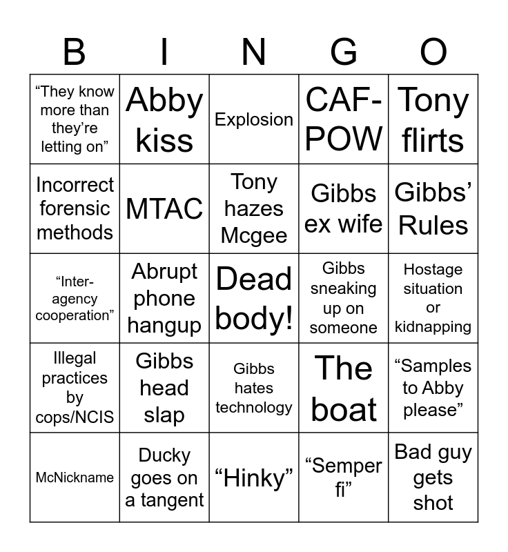 This bingo card has a free space and 24 words: Gibbs head slap, Ducky goes on a tangent, Tony hazes Mcgee, McNickname, Tony flirts, “They know more than they’re letting on”, Incorrect forensic methods, Abby kiss, Gibbs sneaking up on someone, Gibbs hates technology, Gibbs ex wife, “Inter-agency cooperation”, The boat, “Samples to Abby please”, MTAC, “Semper fi”, Hostage situation or kidnapping, Explosion, Gibbs’ Rules, Abrupt phone hangup, Bad guy gets shot, Illegal practices by cops/NCIS, CAF-POW and “Hinky”.
