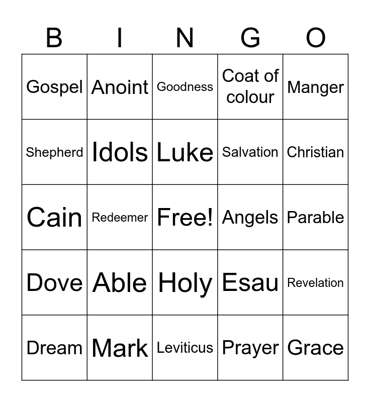This bingo card has a free space and 139 words: Genesis, Adam, We've, Flood, Rainbow, Dove, Ark, Abraham, Birthright, Eden, Burning bush, Moses, Egyptians, Slavery, Passover, Pharoah, Commandments, God, Jesus, Ruth, Esther, Lions Den, Psalm, David, Goliath, Shepherd, Anoint, Hebrews, Mary, Joseph, Temple, Forgiveness, Cross, Salvation, Pilot, Wisemen, Herod, Cesar, Angels, Disciples, Garden, Exodus, Leviticus, Numbers, Deuteronomy, Joshua, Kings, Chronicles, Nehemiah, Malachi, Matthew, Mark, Luke, John, Acts, Corinthians, Peter, Timothy, Apostles, Elijah, Dream, Father, Heaven, Beginning, Earth, Creation, Fruit, Covenant, Bethlehem, Revelation, Gospel, Bible, Love, Joy, Peace, Patience, Kindness, Goodness, Faithfulness, Gentleness, Self control, Spirit, Holy, Olive branch, Parable, 5000, Samuel, Desert, Wilderness, Isaiah, Crucified, Grave, Risen, Donkey, Manger, Glory, Baptize, Fire, Wander, Judges, Repent, Redeemer, Lord, Prayer, Hallelujah, Lazarus, Plagues, Sermon, Followers, Christian, Kneel, Idols, Fishermen, Saul, Samson, Cain, Able, Worship, Esau, Jacob, Judas, Good Samaritan, Fish, Bread, Blood, Lamb, Offering, Temptation, Devil, Paradise, Guard, Tomb, Thomas, Coat of colour, Grace, Mercy, Song, Flute and Prayer.