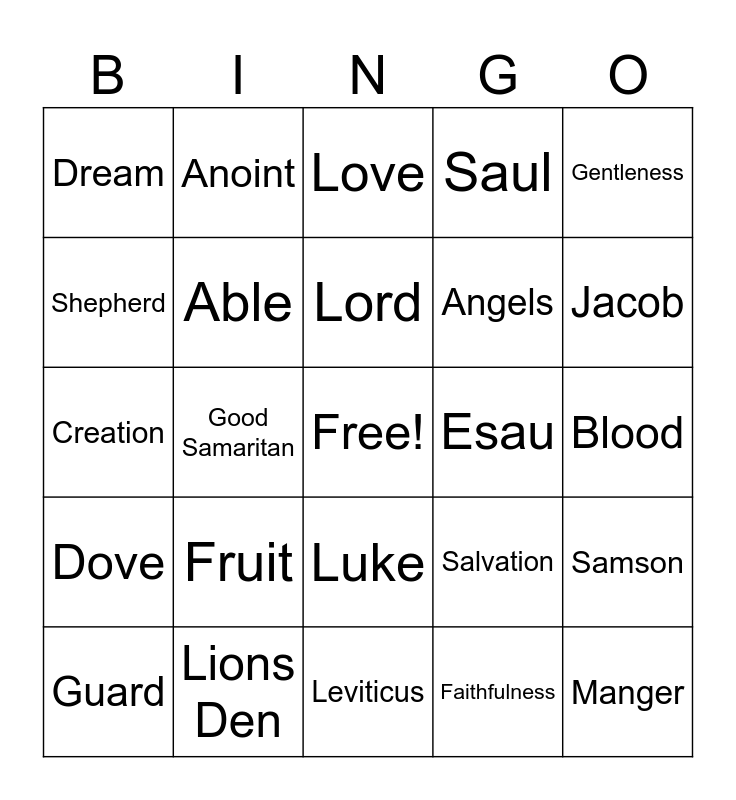 This bingo card has a free space and 148 words: Genesis, Adam, We've, Flood, Rainbow, Dove, Ark, Abraham, Birthright, Eden, Burning bush, Moses, Egyptians, Slavery, Passover, Pharoah, Commandments, God, Jesus, Ruth, Esther, Lions Den, Psalm, David, Goliath, Shepherd, Anoint, Hebrews, Mary, Joseph, Temple, Forgiveness, Cross, Salvation, Pilot, Wisemen, Herod, Cesar, Angels, Disciples, Garden, Exodus, Leviticus, Numbers, Deuteronomy, Joshua, Kings, Chronicles, Nehemiah, Malachi, Matthew, Mark, Luke, John, Acts, Corinthians, Peter, Timothy, Apostles, Elijah, Dream, Father, Heaven, Beginning, Earth, Creation, Fruit, Covenant, Bethlehem, Revelation, Gospel, Bible, Love, Joy, Peace, Patience, Kindness, Goodness, Faithfulness, Gentleness, Self control, Spirit, Holy, Olive branch, Parable, 5000, Samuel, Desert, Wilderness, Isaiah, Crucified, Grave, Risen, Donkey, Manger, Glory, Baptize, Fire, Wander, Judges, Repent, Redeemer, Lord, Prayer, Hallelujah, Lazarus, Plagues, Sermon, Followers, Christian, Kneel, Idols, Fishermen, Saul, Samson, Cain, Able, Worship, Esau, Jacob, Judas, Good Samaritan, Fish, Bread, Blood, Lamb, Offering, Temptation, Devil, Paradise, Guard, Tomb, Thomas, Coat of colour, Grace, Mercy, Song, Flute, Isaac, Miracle, Promise, Light, Lamp, Bride, Palm branch, Hosanna, Praise and Soul.