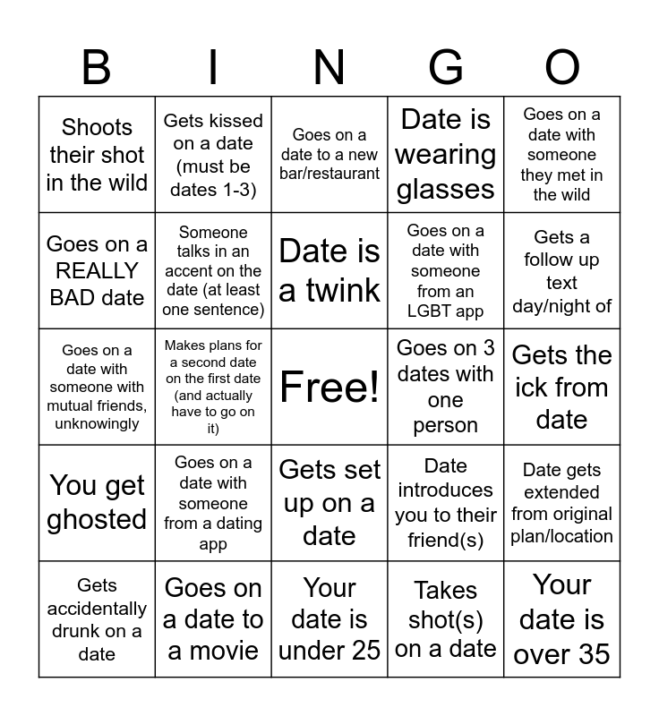 This bingo card has a free space and 24 words: Goes on a date with someone from a dating app, Goes on a date to a movie, Date is a twink, Gets accidentally drunk on a date, Goes on a date with someone they met in the wild, Shoots their shot in the wild, Goes on a REALLY BAD date, Gets kissed on a date (must be dates 1-3), Goes on 3 dates with one person, Gets set up on a date, Goes on a date with someone from an LGBT app, Goes on a date with someone with mutual friends, unknowingly, Date introduces you to their friend(s), Date gets extended from original plan/location, Someone talks in an accent on the date (at least one sentence), Takes shot(s) on a date, Gets the ick from date, Goes on a date to a new bar/restaurant, Gets a follow up text day/night of, Makes plans for a second date on the first date (and actually have to go on it), Your date is over 35, You get ghosted, Date is wearing glasses and Your date is under 25.